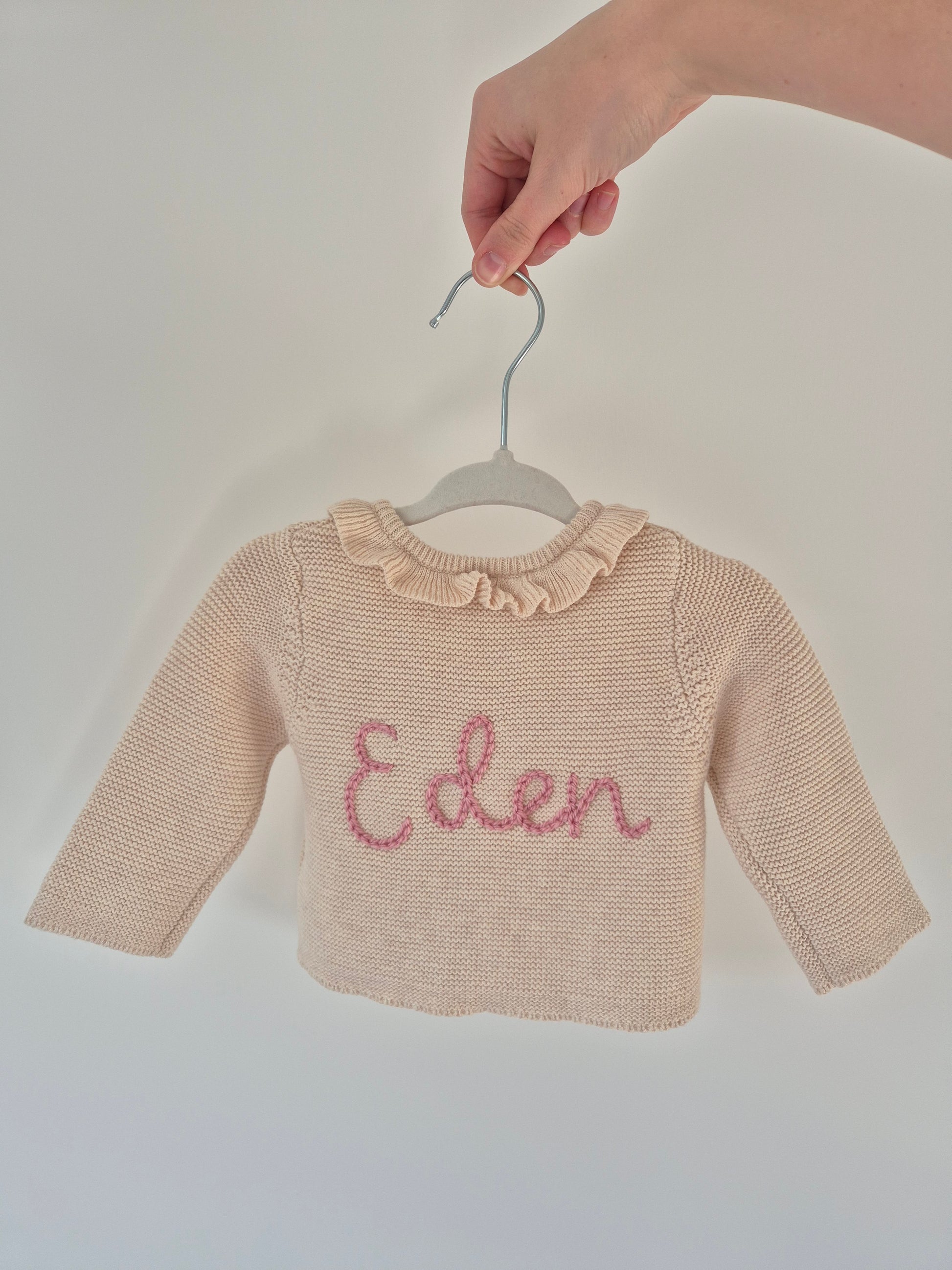 Personalised name embroidery is included in the price, in any colour of your choosing! You may also add extra details such as roses, daisies, hearts, bows, and more! Send me a message and let's create a unique custom piece of knitwear for your precious little one.