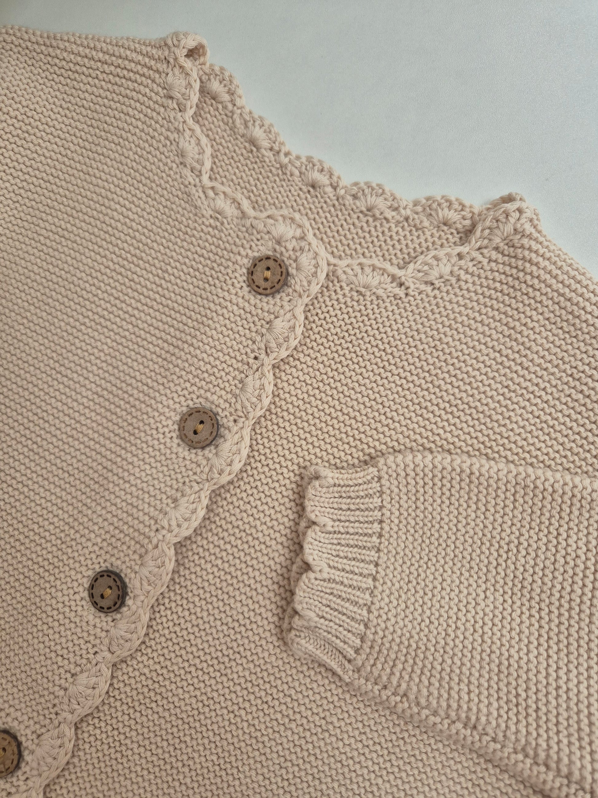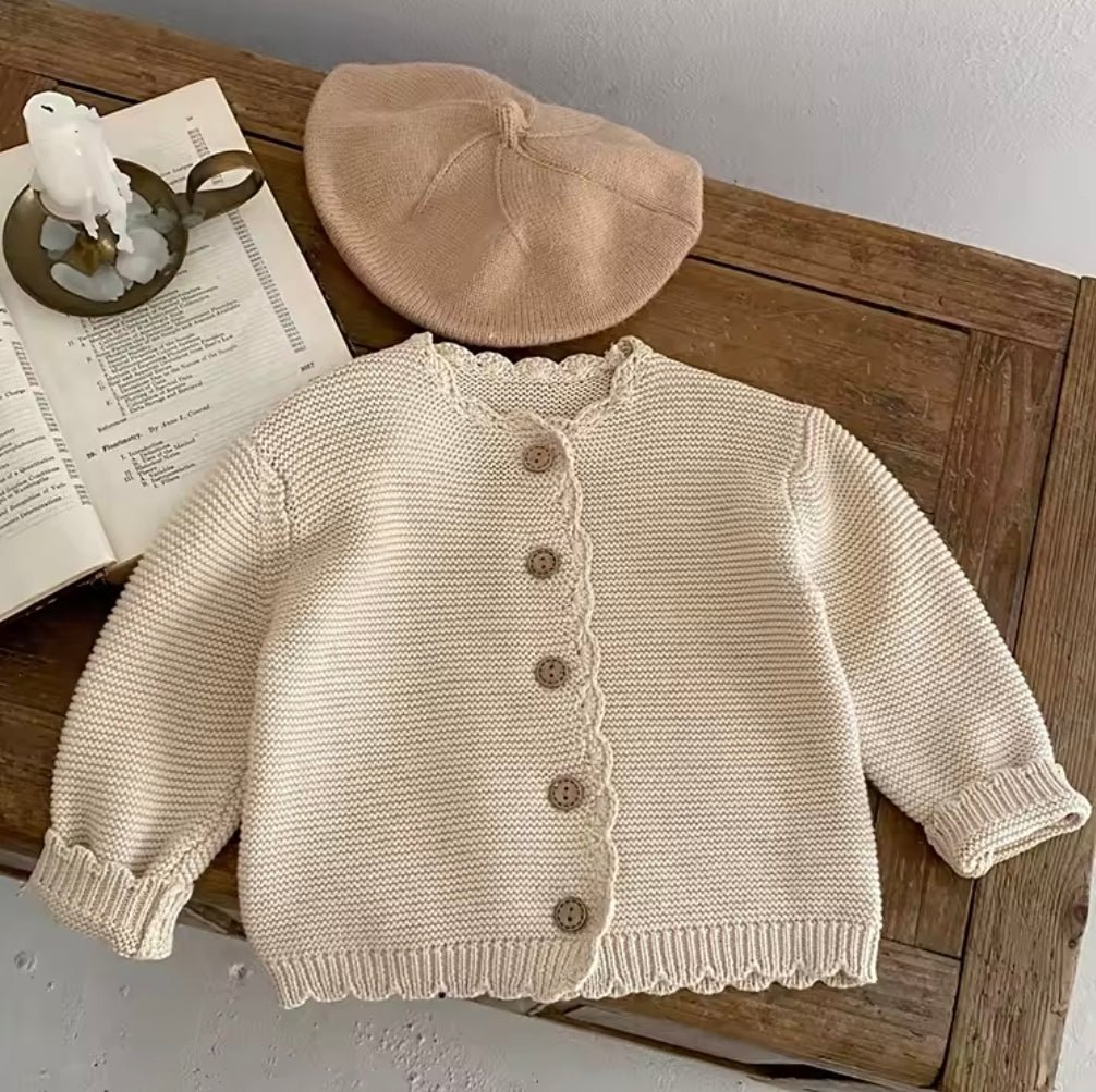 Ready for personalised name embroidery for your little one! Beautiful beige scallop edge cardigan with a full button front closure - perfect for layering in all weather! Especially perfect for cosy autumn and winter months.